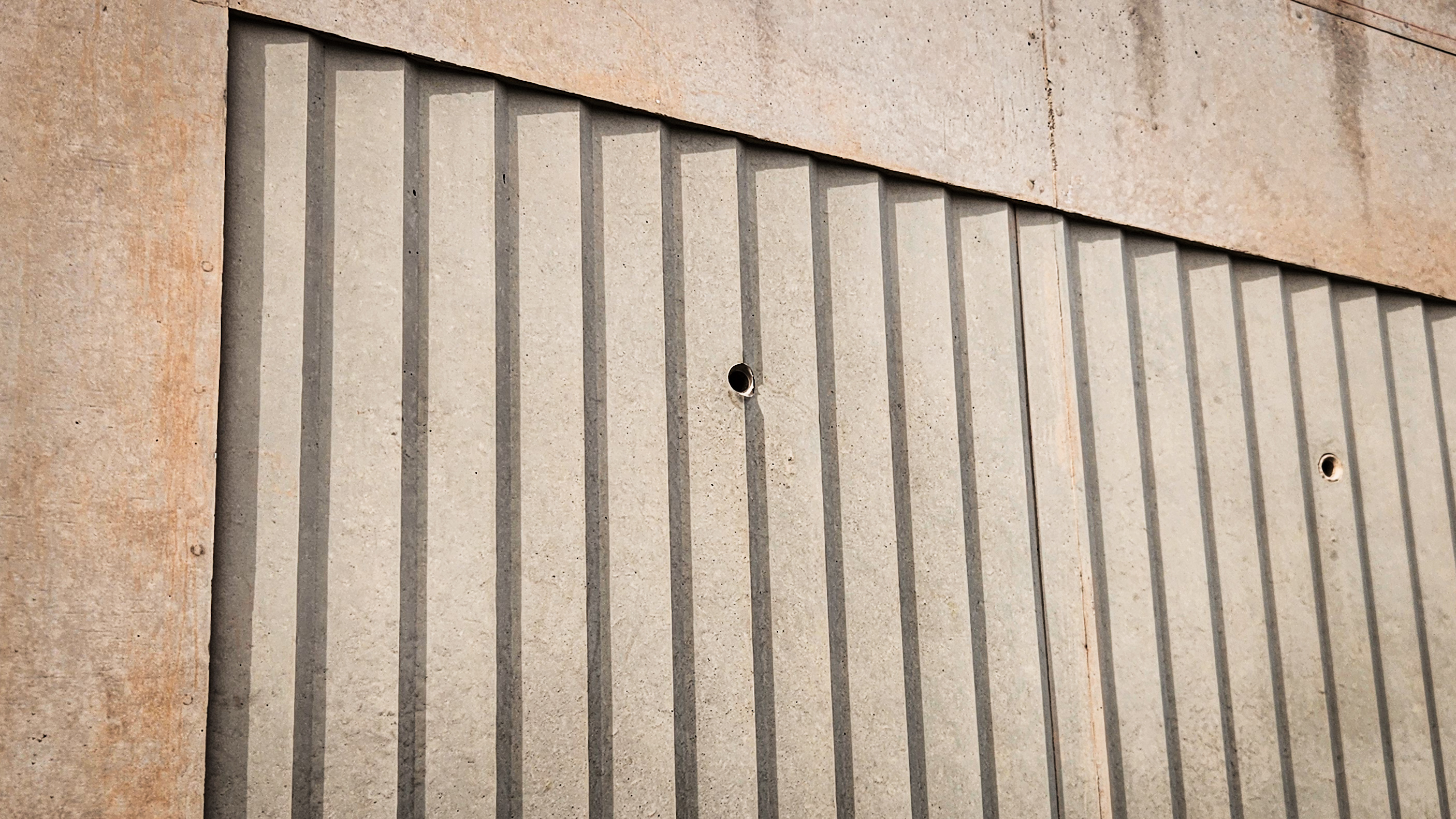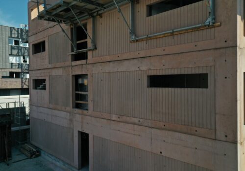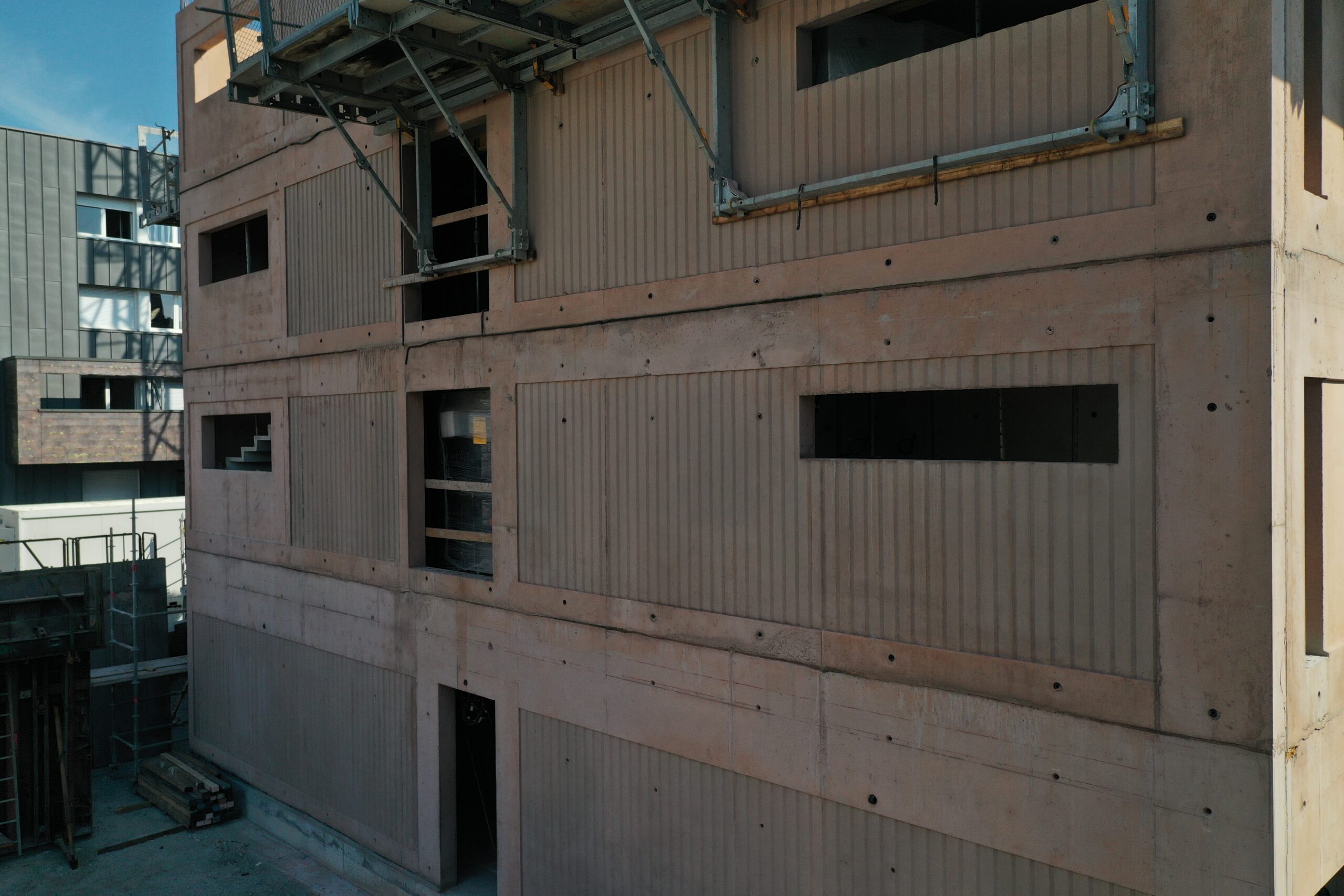 Les façades du bâtiment sont teintées en Brun Sienne et les deux pignons présentent une matrice donnant un effet de succession de lamelles avec des négatifs de 3 cm. Les façades intègrent des rupteurs thermiques sur le linéaire et un calepinage de banches a été réalisé.