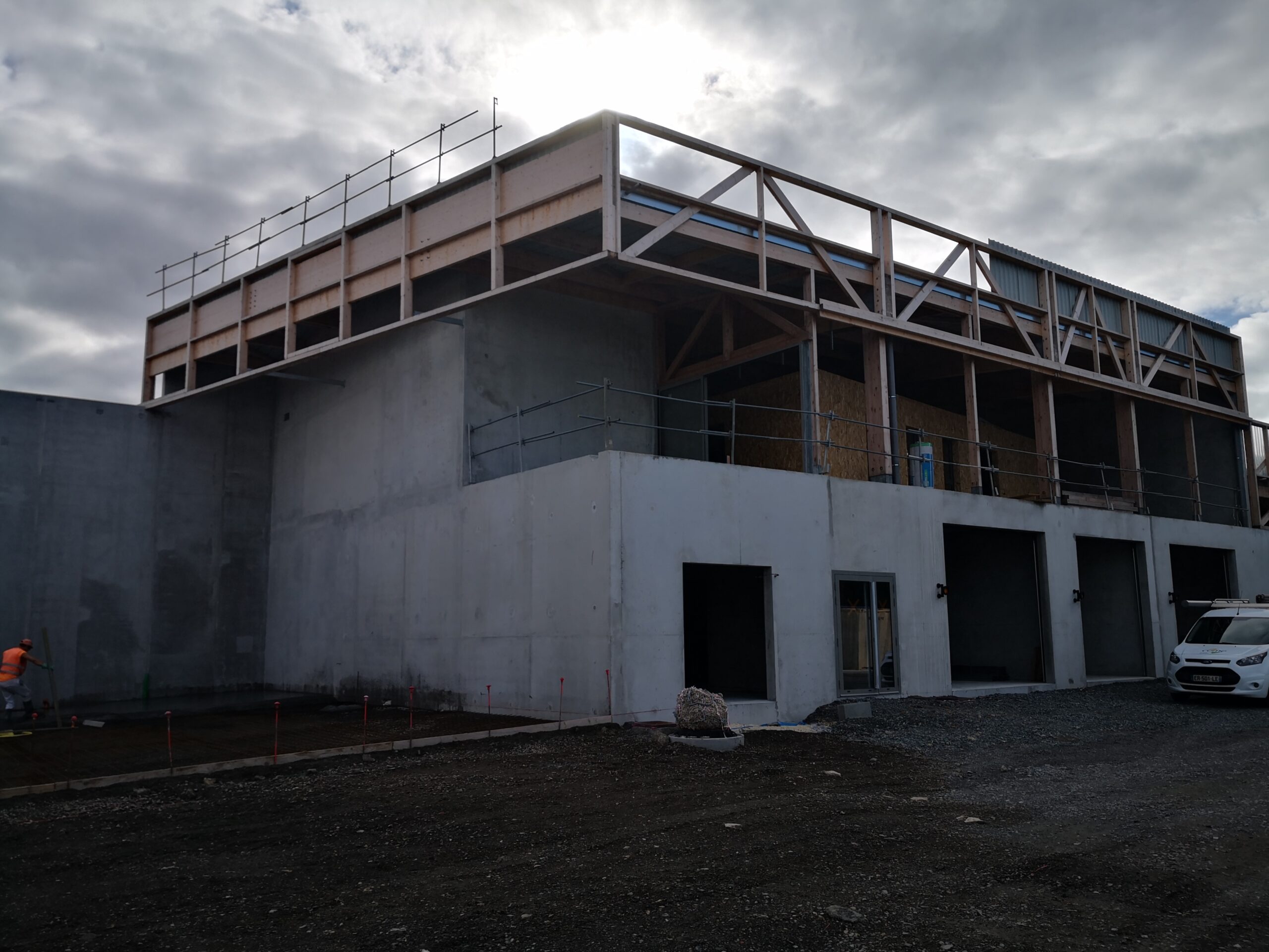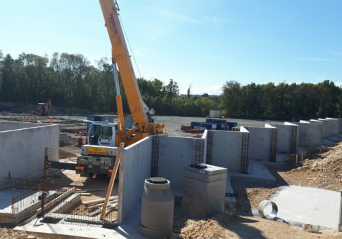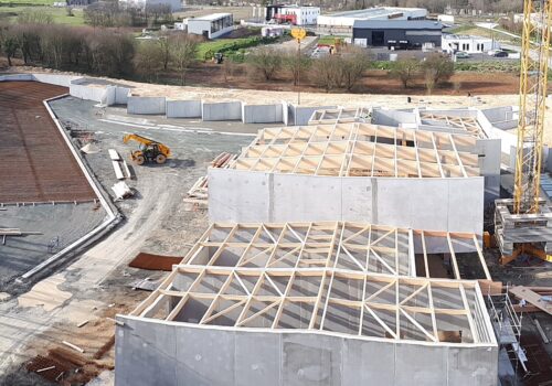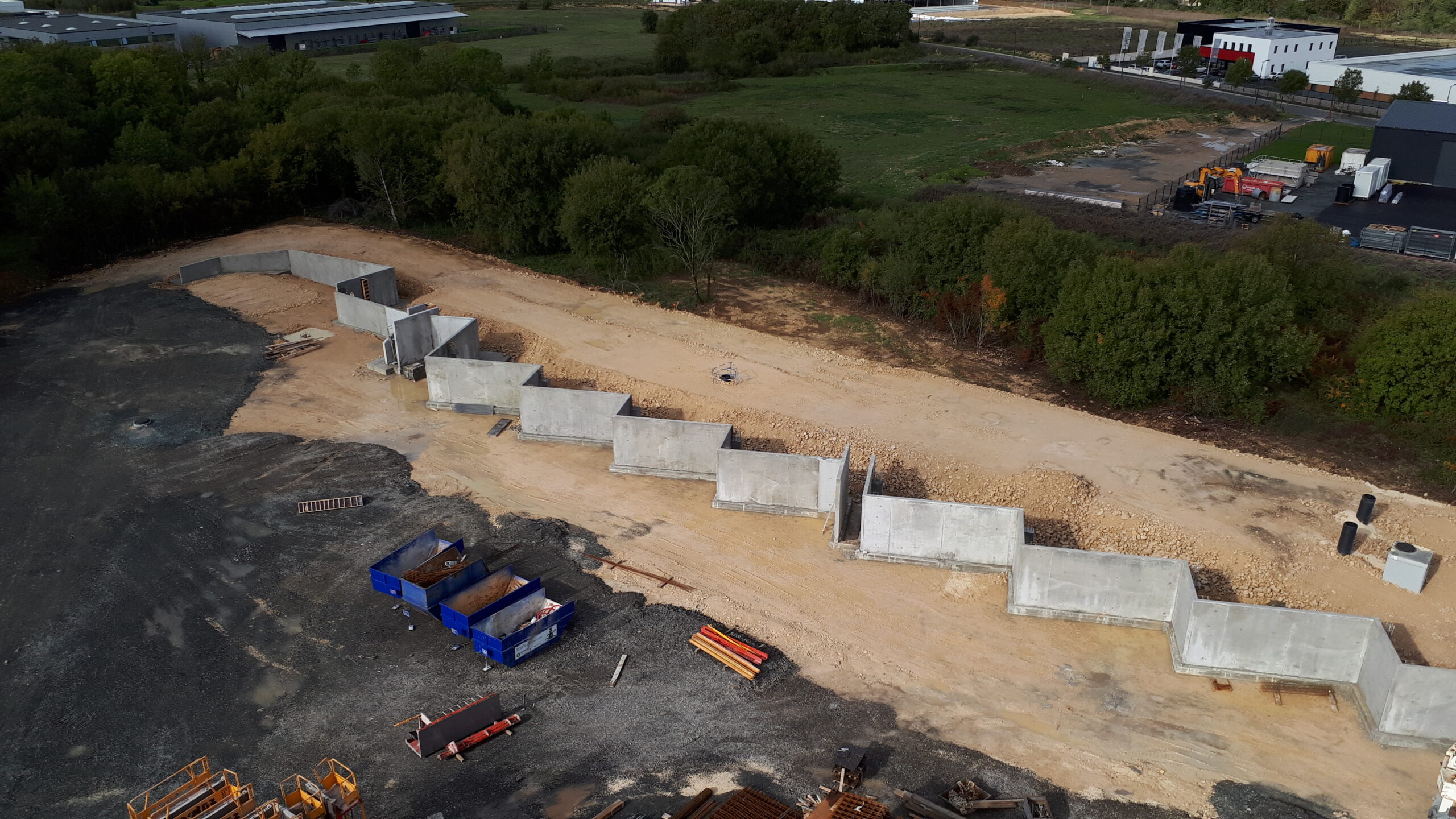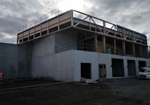 Construction d’une déchetterie zone Atlanparc à Périgny. Construction sur système massifs, longrines, dalle portée. Structure principale, en élévation, en voiles béton armé. Nous avons aussi un système de fondations sur micropieux dans la zone des quais.