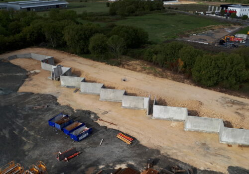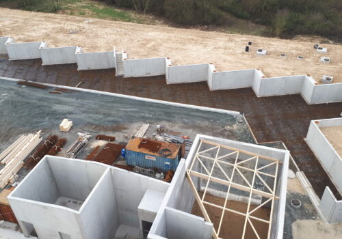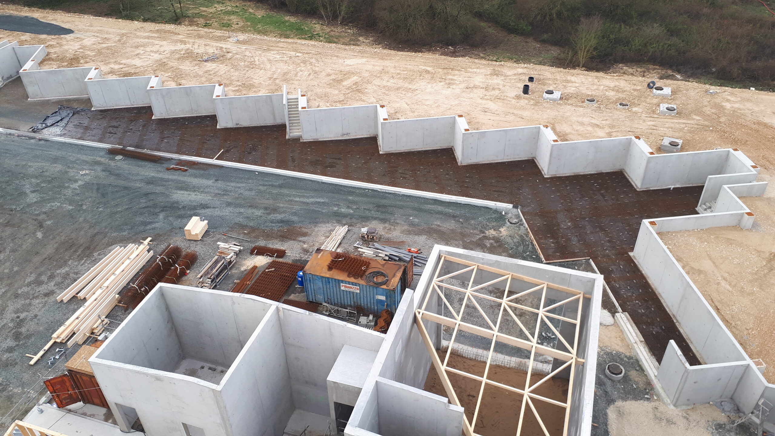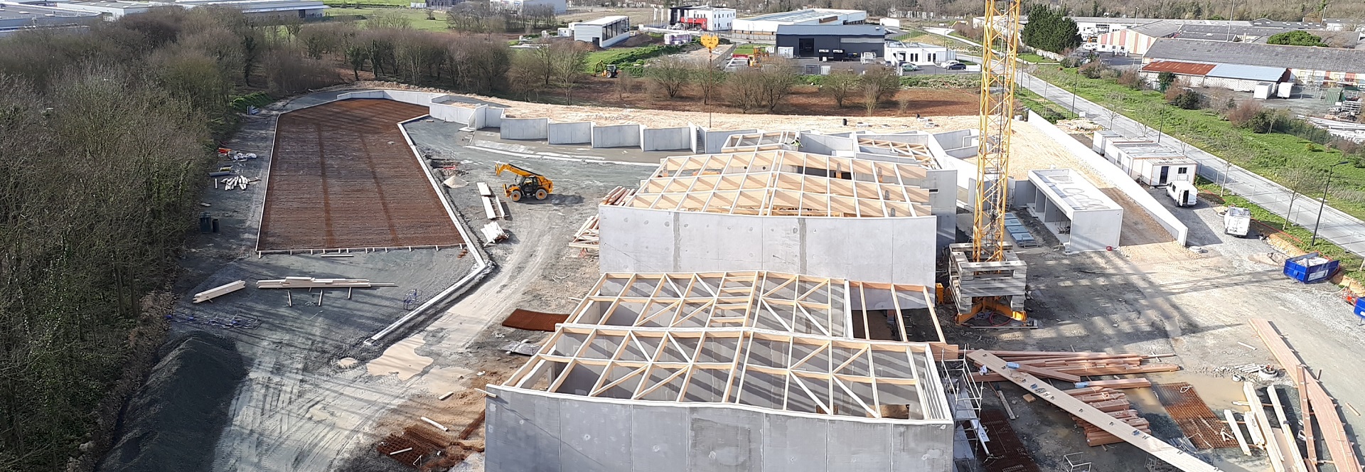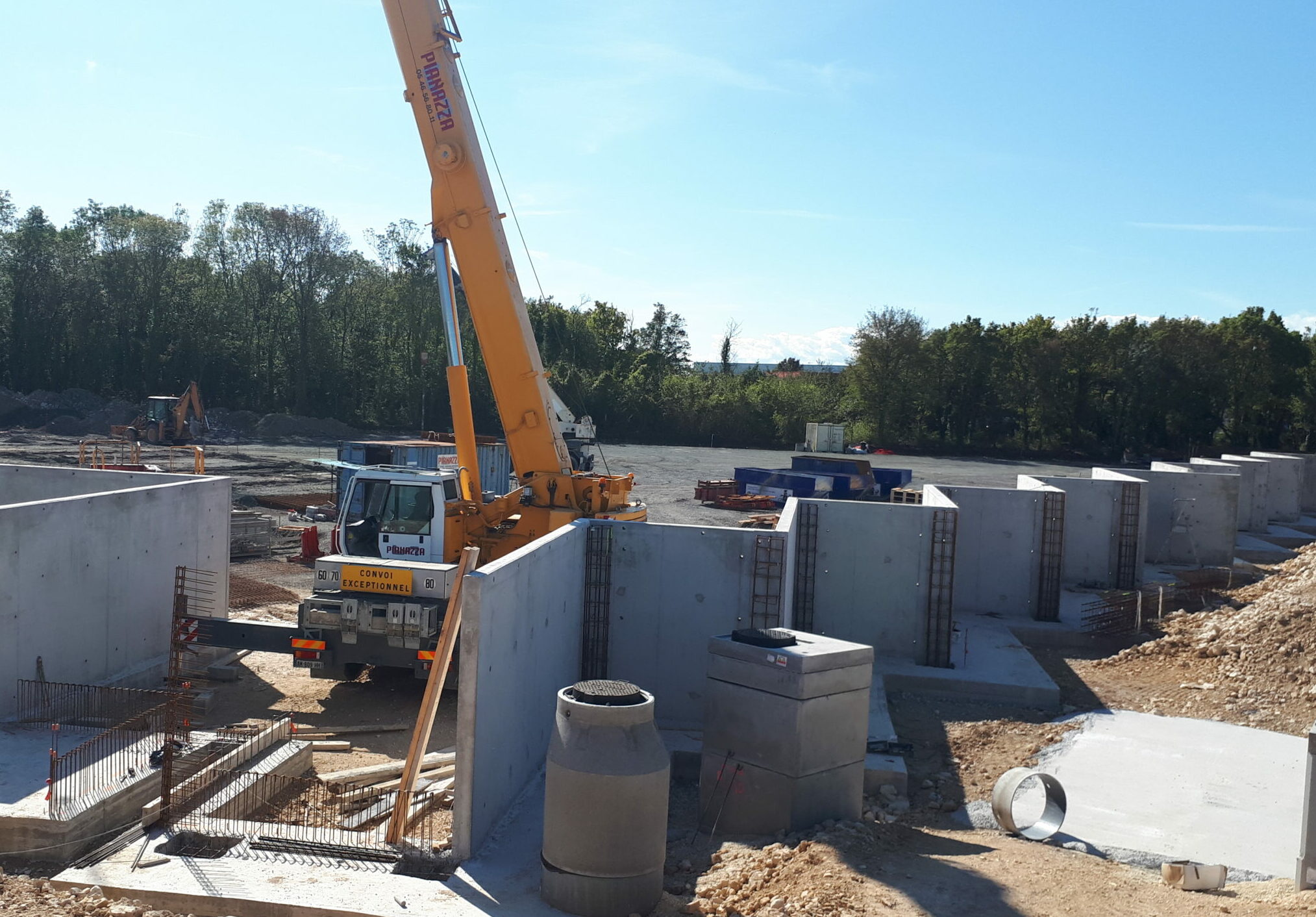 Construction d’une déchetterie zone Atlanparc à Périgny. Construction sur système massifs, longrines, dalle portée. Structure principale, en élévation, en voiles béton armé. Nous avons aussi un système de fondations sur micropieux dans la zone des quais.