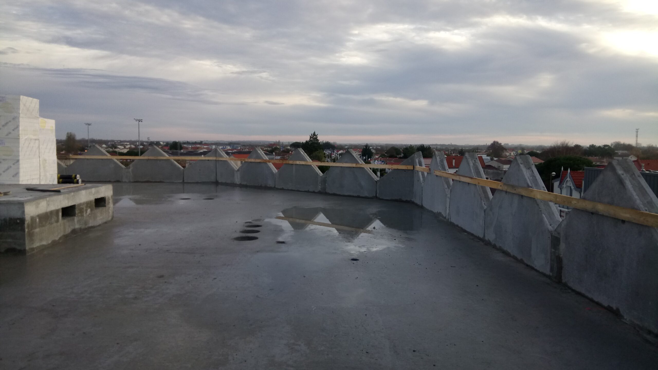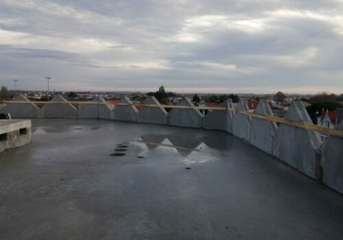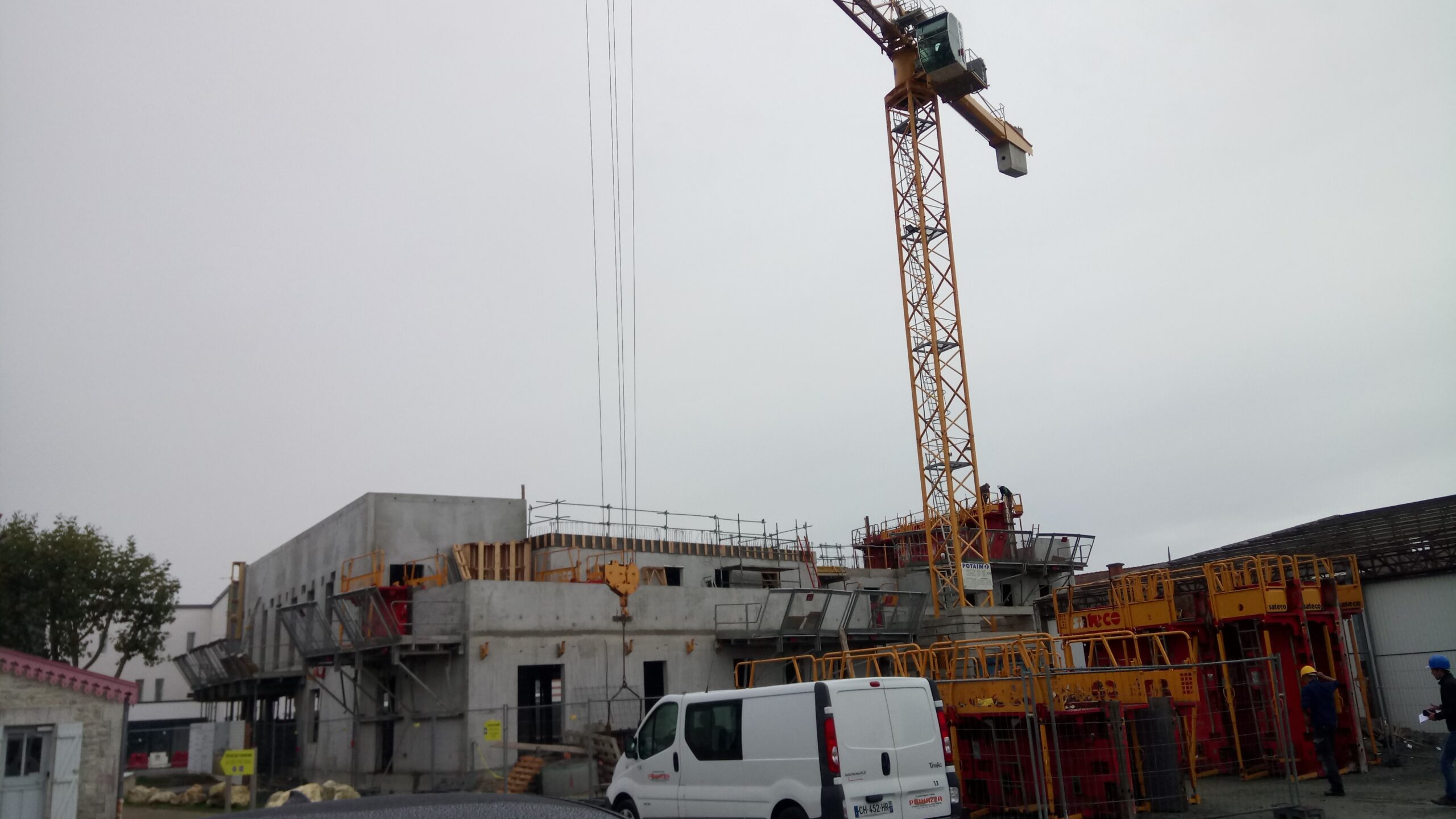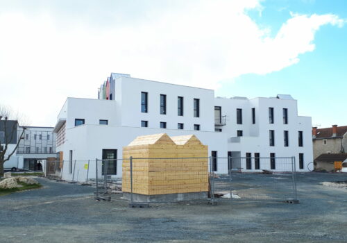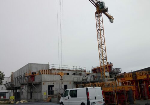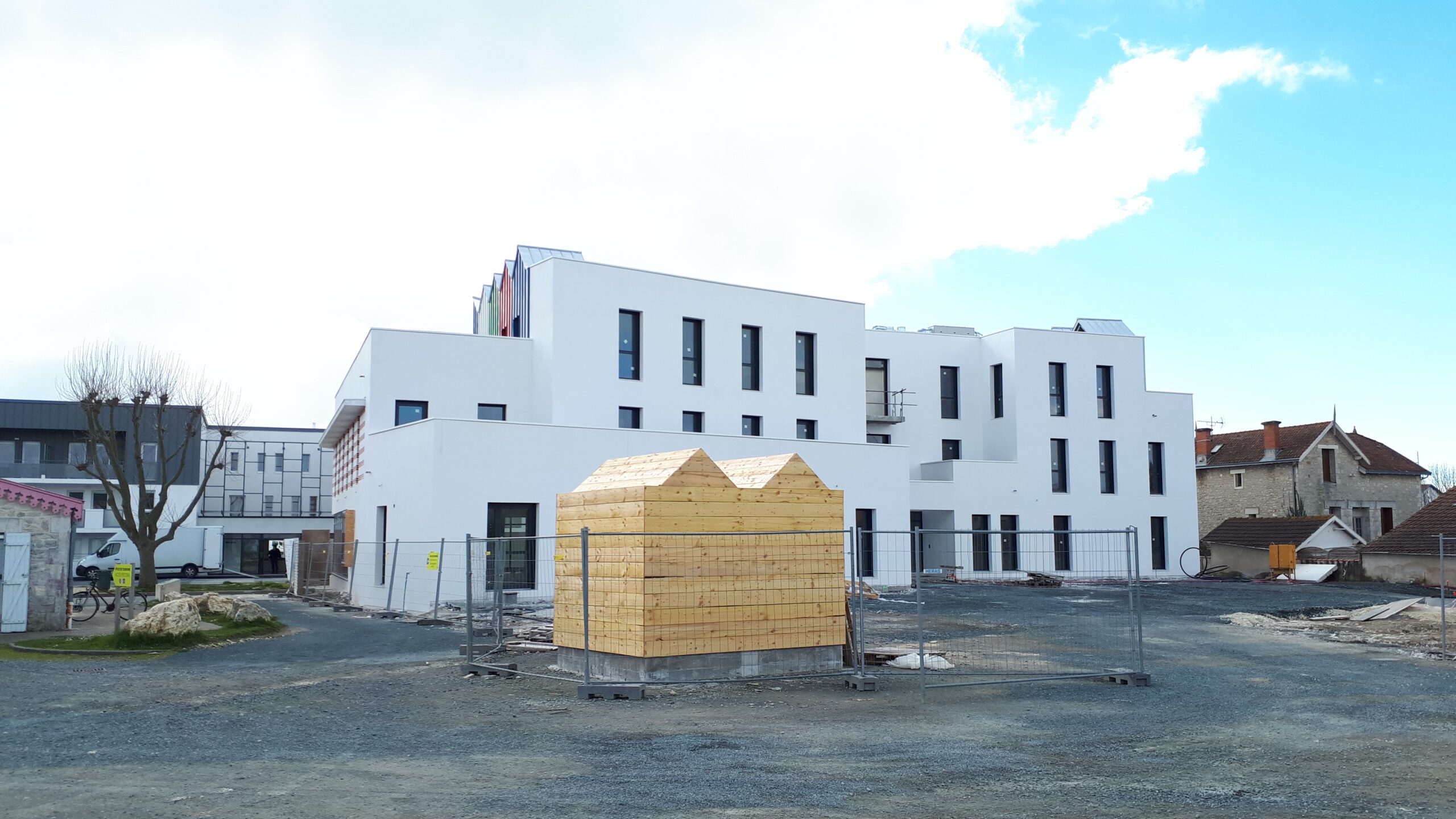 Construction neuve d’un pôle santé en R+2, incluant des casquettes en porte-à-faux et des voiles courbes en façade.