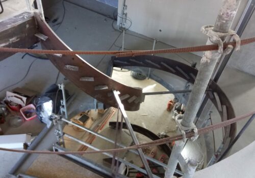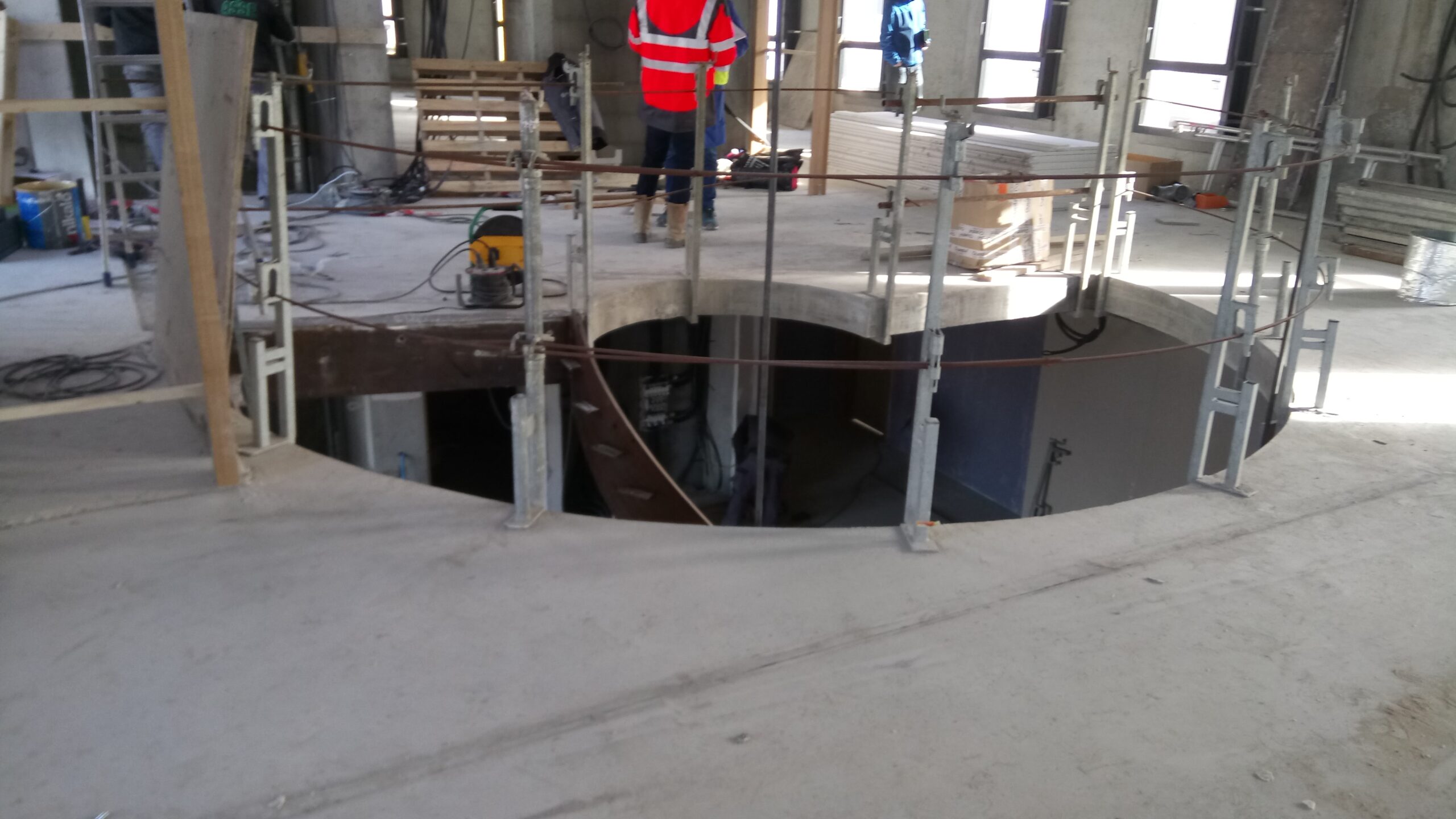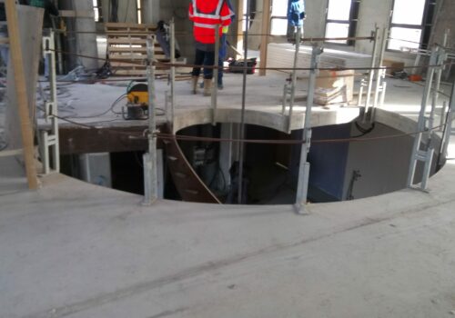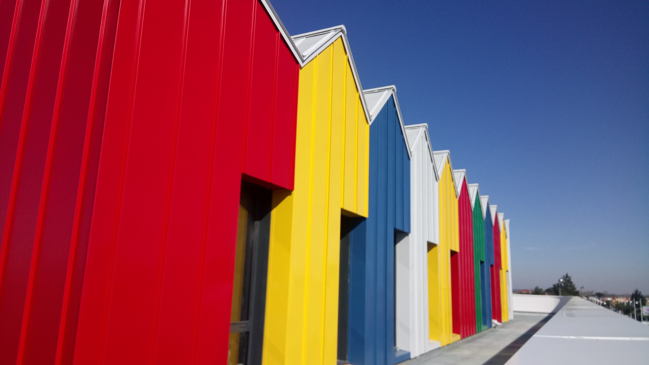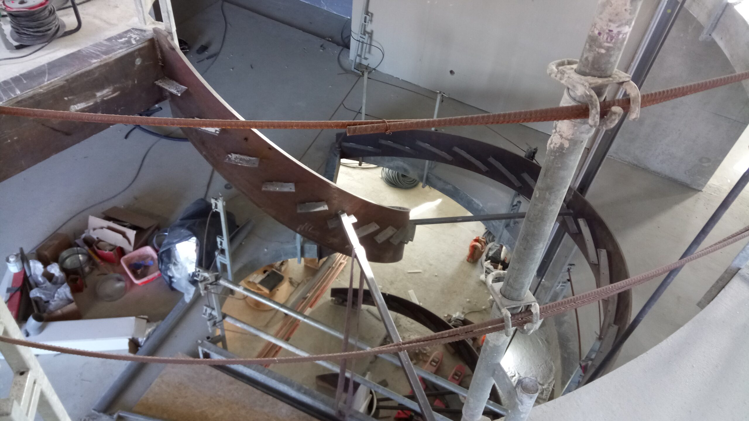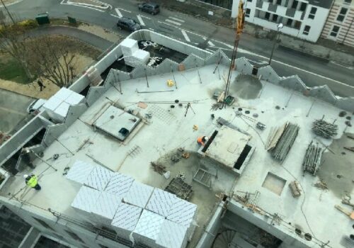 Construction neuve d’un pôle santé en R+2, incluant des casquettes en porte-à-faux et des voiles courbes en façade.