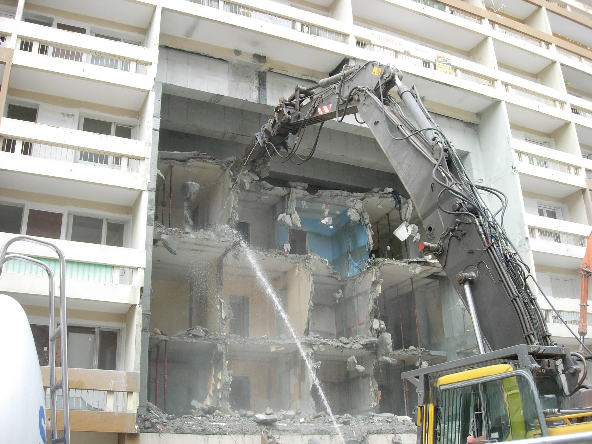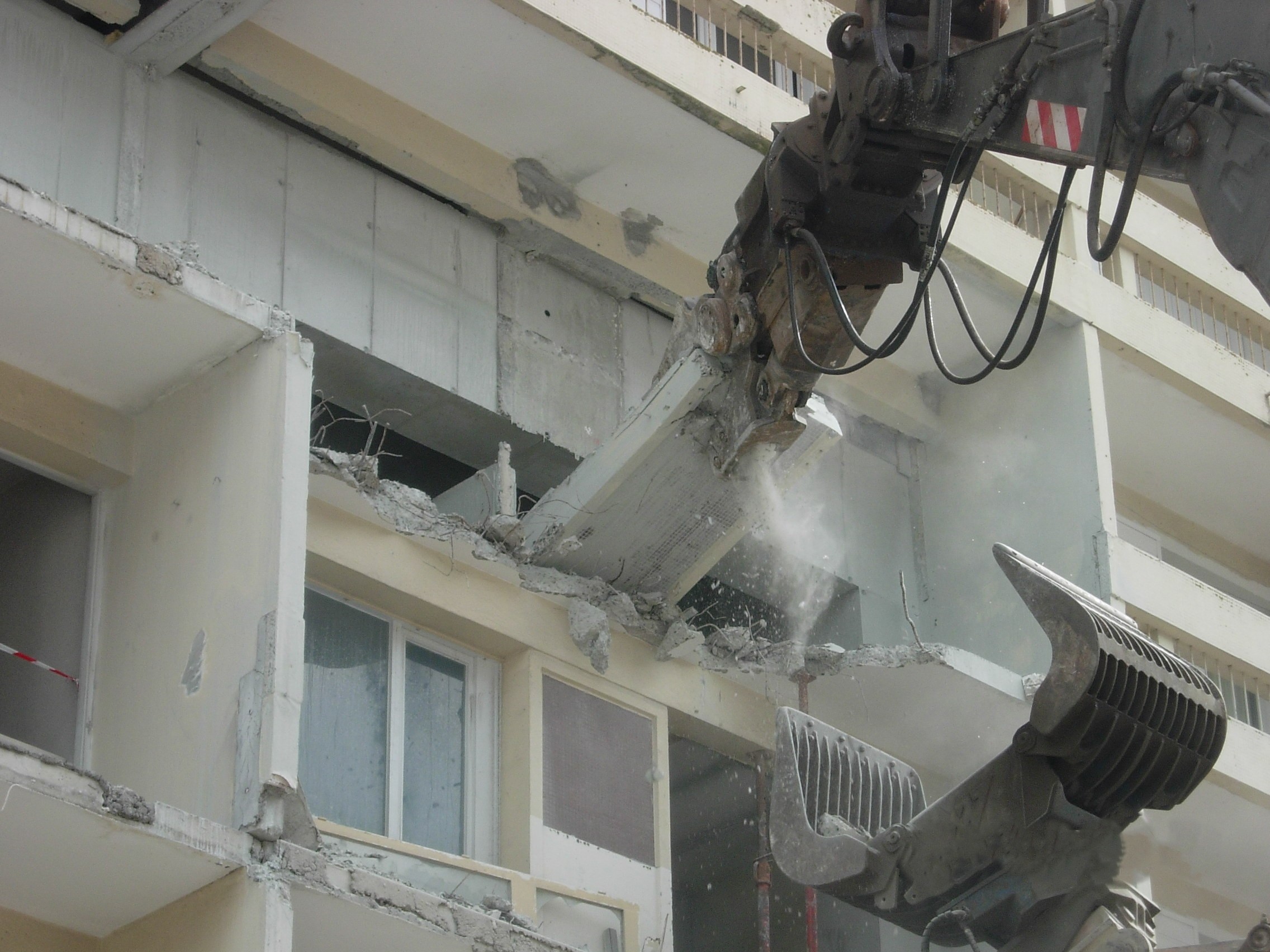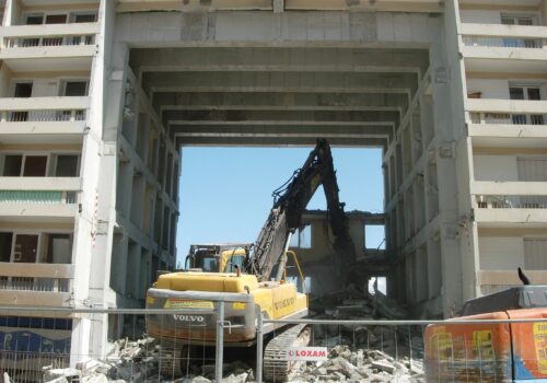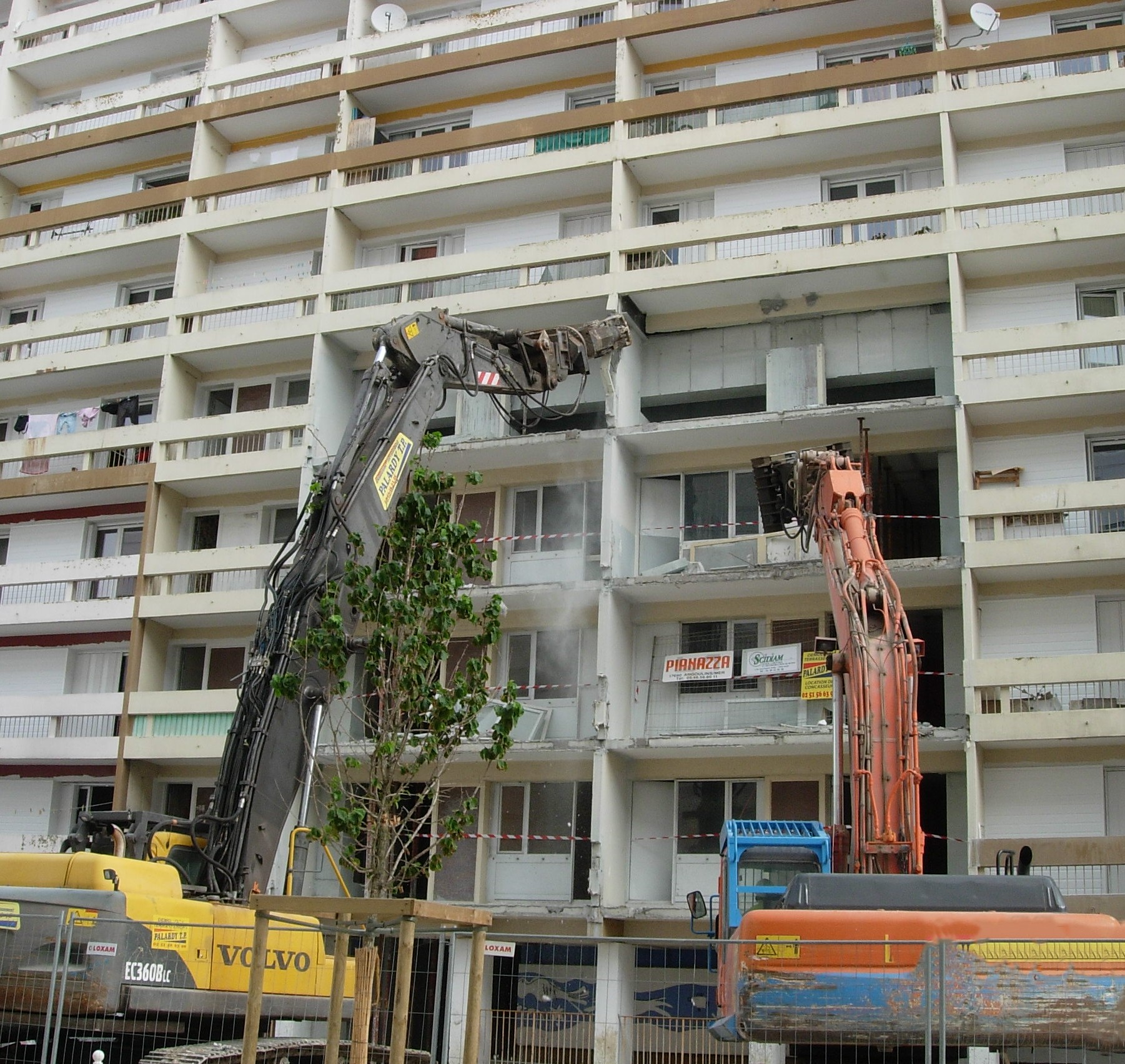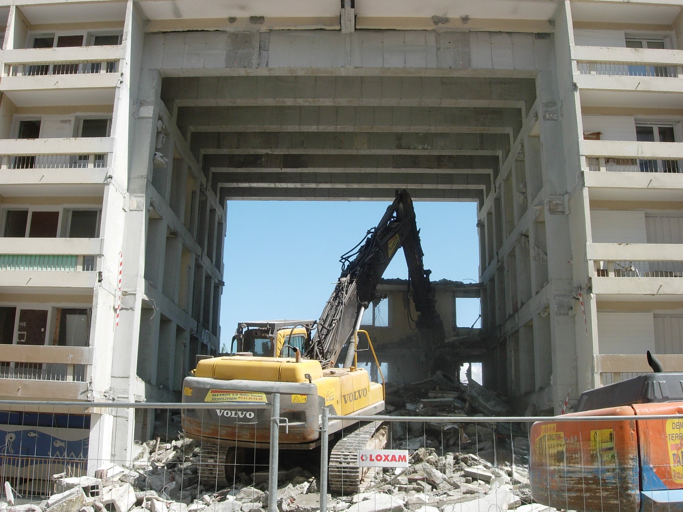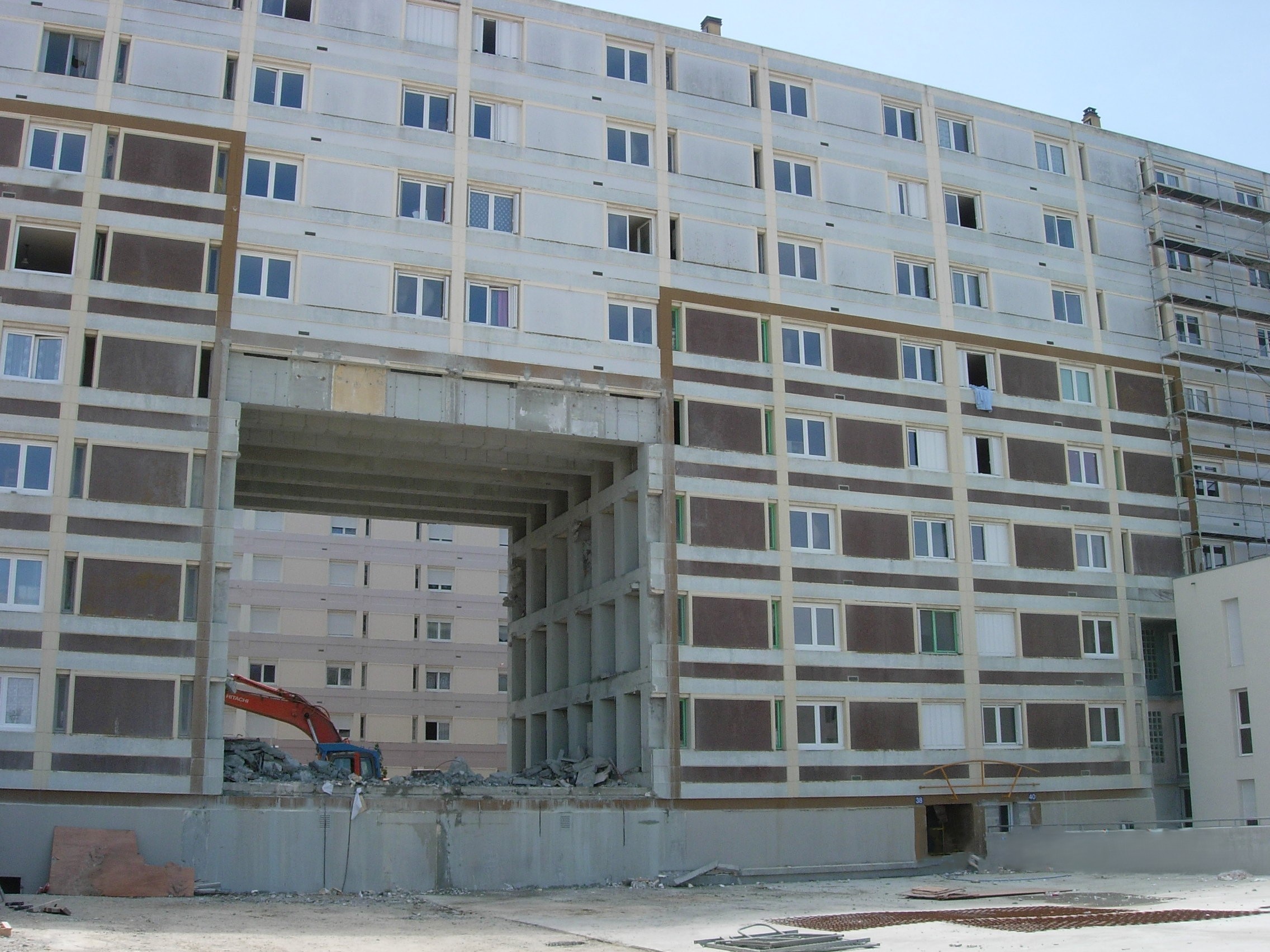 Réhabilitation immeuble Utrillo à Mireuil. Démolition partielle d’un bâtiment pour création de 3 arches. Coulage de poteaux poutres pour soutenir l’existant. Démolition à la pince..