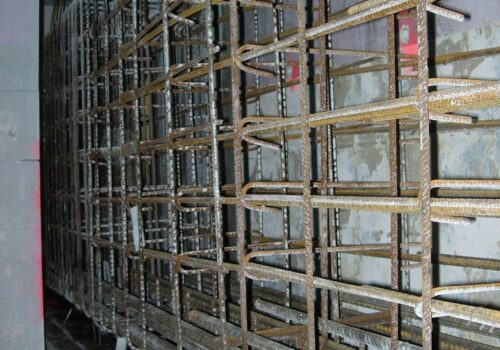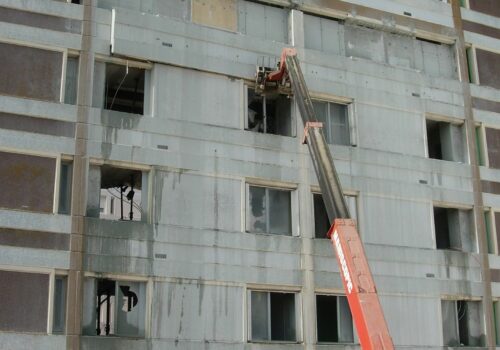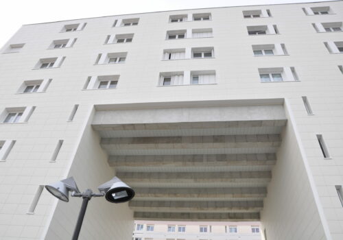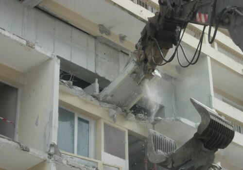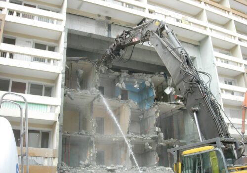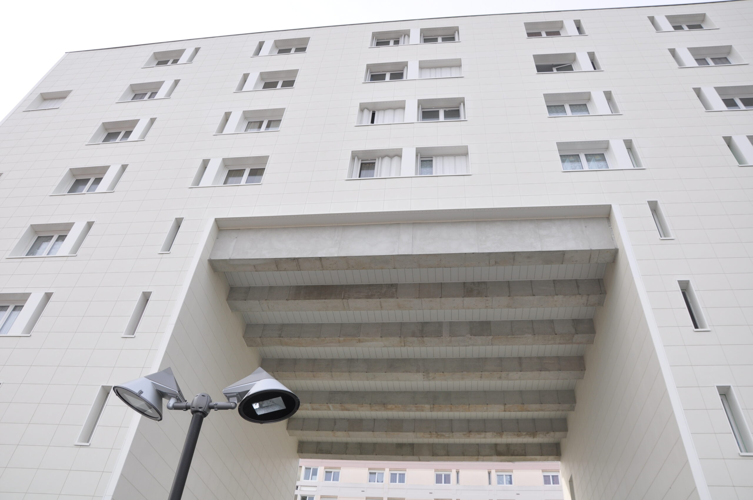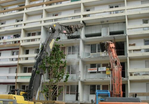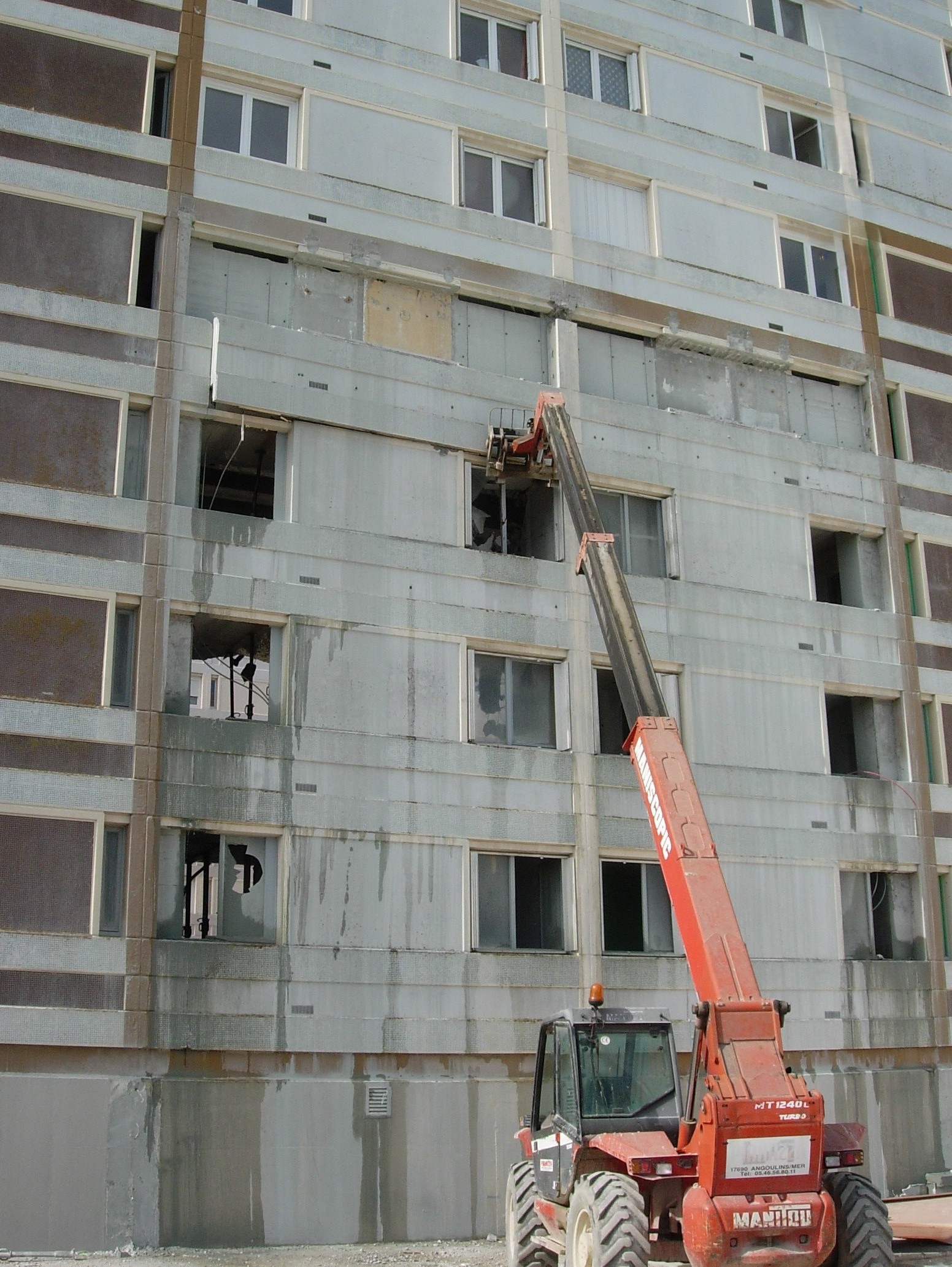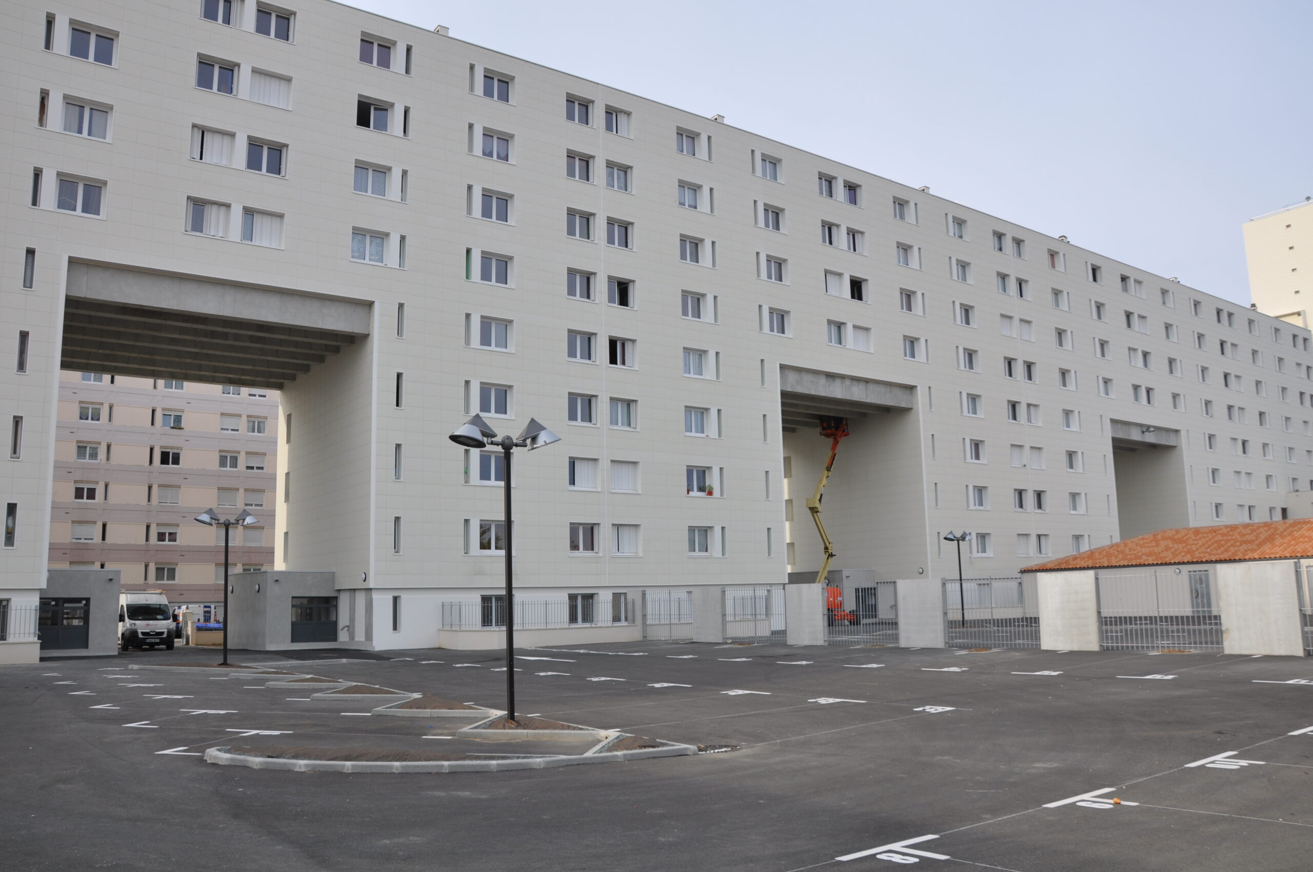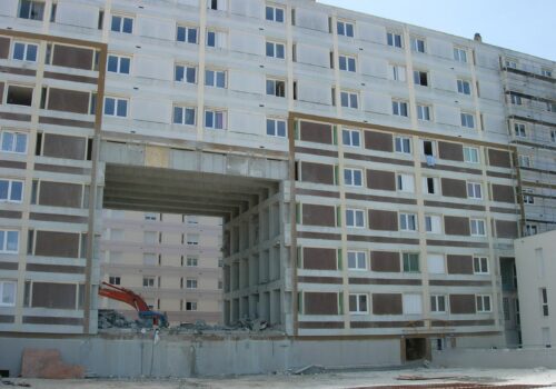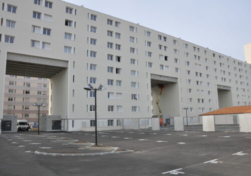 Réhabilitation immeuble Utrillo à Mireuil. Démolition partielle d’un bâtiment pour création de 3 arches. Coulage de poteaux poutres pour soutenir l’existant. Démolition à la pince..